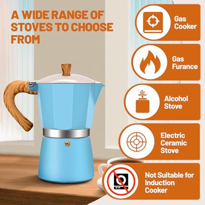 6 Cup Blue Aluminum Moka Pot & 4 Cup Stainless Steel Espresso Stovetop Coffee maker Percolator Italian Coffee Maker
