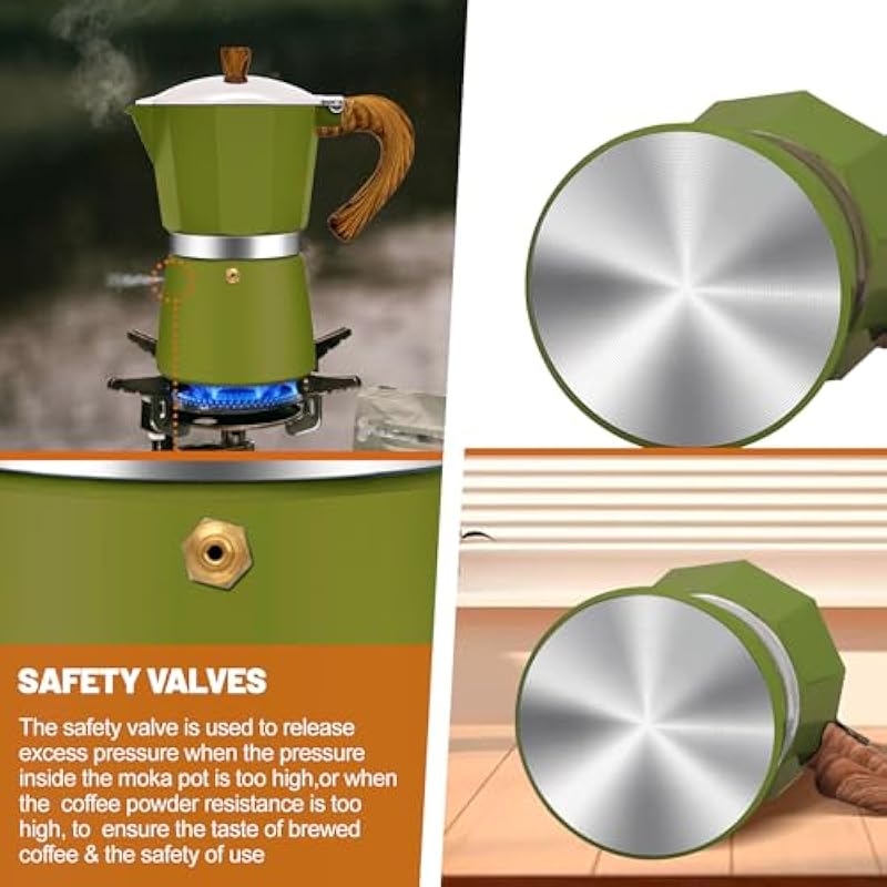 6 Cup Green Aluminum Moka Pot Express Coffee Maker Percolator Italian Classic Mocha Coffee Machine with 2 Pcs Filter with 3 Pcs Seals for 6 Cup Coffee Maker Replacement Parts