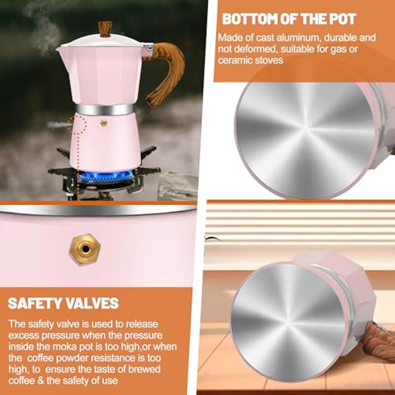 6 Cup Pink Aluminum Moka Pot Express Coffee Maker Percolator Italian Classic Mocha Coffee Machine with 2 Pcs Filter with 3 Pcs Seals for 6 Cup Coffee Maker Replacement Parts