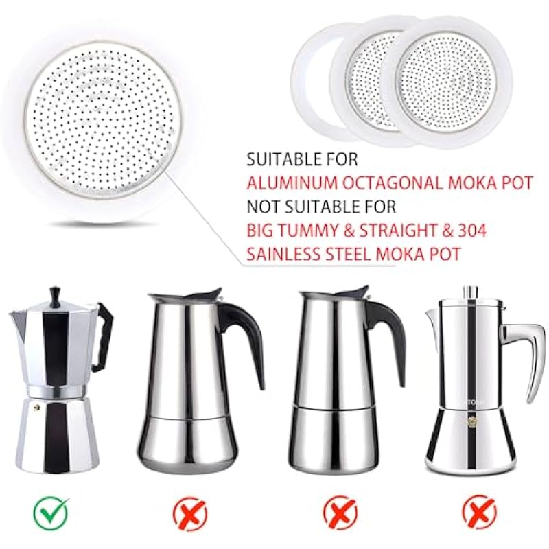 - 6 Cup Aluminum Moka Pot Express Coffee Maker Percolator Italian Classic Mocha Coffee Machine with 2 Pcs Filter with 3 Pcs Seals for 6 Cup Coffee Maker Replacement PartsCore parts are all available, no need to search for suitable parts separately. Commonly used filters and seals are in stock and can be replaced at any time.
