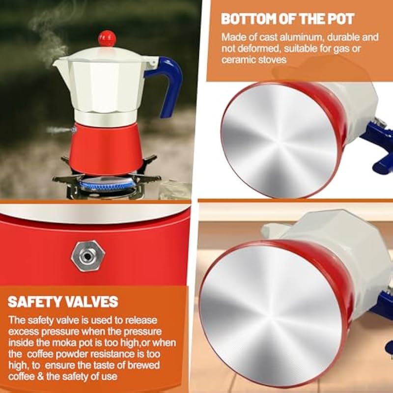 - How to Prepare the Coffee: When you use it for the first time, the coffee pot may emit an unpleasant smell, please don’t worry too much, this is a normal situation. Pls add tea, oranges, detergent, or other items to remove odor and wash several times before use. Can be used on gas or ceramic stove tops, allows you to create and enjoy the best-tasting coffee with utmost ease. Classic Italian style design ensures even heat distribution for rich, velvety coffee flavor and aroma