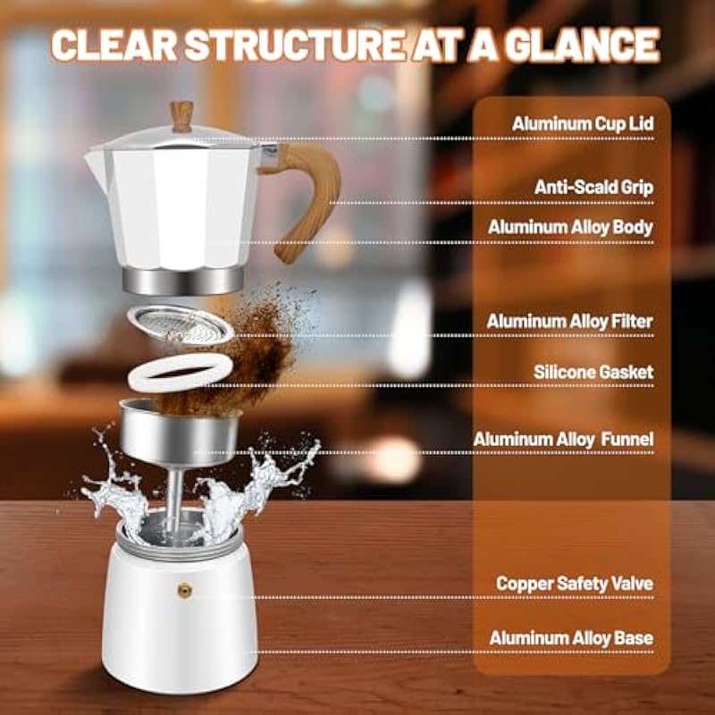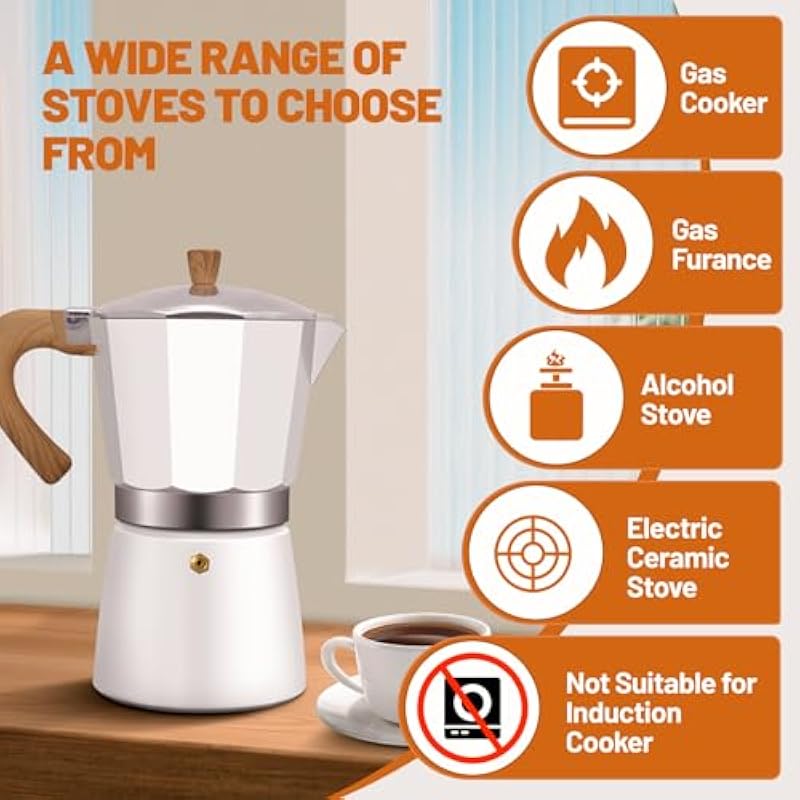- How to Prepare the Coffee: When you use it for the first time, the coffee pot may emit an unpleasant smell, please don’t worry too much, this is a normal situation. Pls add tea, oranges, detergent, or other items to remove odor and wash several times before use. Can be used on gas or ceramic stove tops, allows you to create and enjoy the best-tasting coffee with utmost ease. Classic Italian style design ensures even heat distribution for rich, velvety coffee flavor and aroma
