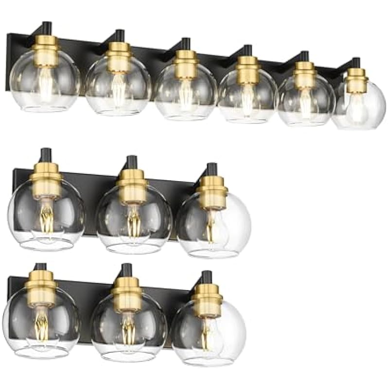 - INSPIRED DESIGN: Our 6 light bathroom light fixtures feature a combination of clear glass globe shades and a sturdiness black and gold metal long base back plate, creating a fusion of timeless elegance and modern minimalism. These bathroom lighting fixtures over mirror are the ultimate choice for your bathroom lighting needs