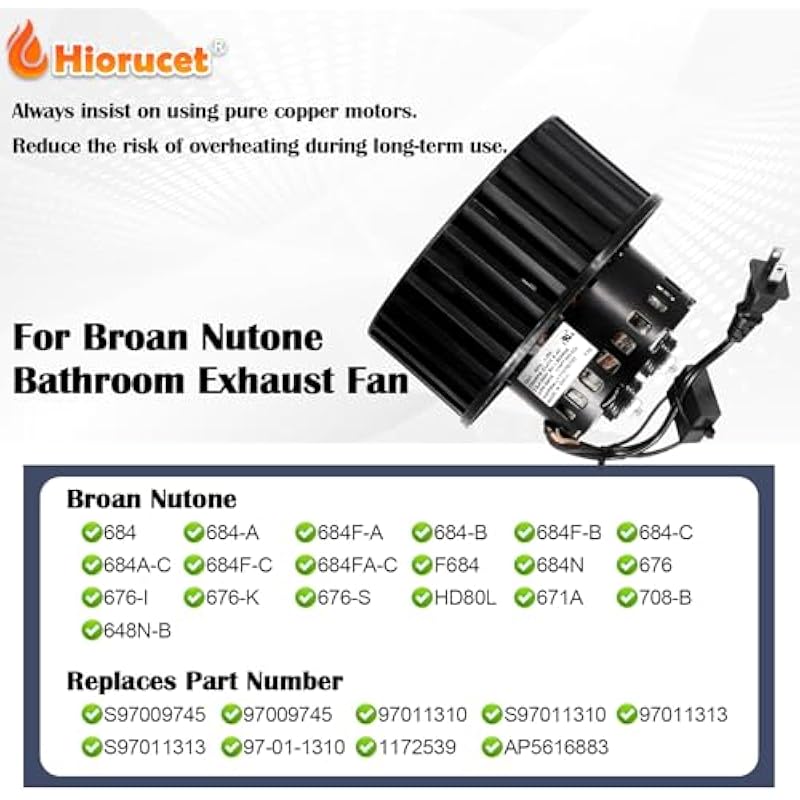 - ► Fit For Broan Nutone Bathroom Exhaust Fan Models – Use with 676, 684N Exhaust Fans, 684, 684-A, 684F-A, 684-B, 684F-B, 684-C, 684A-C, 684F-C, 684FA-C, F684, 684N, 676, 676-I, 676-K, 676-S, HD80L, HD80, 671A, 708-B, 648N-B. ► Replaces Part Number: S97009745, 97009745, 97011310, S97011310, 97011313, S97011313, 97-01-1310, 1172539, AP5616883. Replacement motor only 99080346, 99080518; Wheel Model 99110842.
