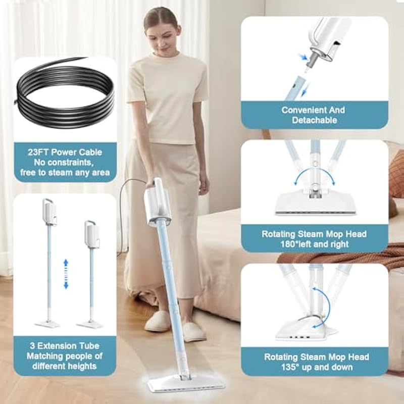 - 【Dual Steam Modes and Effortless Maneuverability】 Switch between two steam modes to tackle light or heavy-duty messes. The 180° swivel head and 135° vertical pivot allow easy access under furniture and around corners, while the extra-long 23FT power cord offers unrestricted movement across large areas.