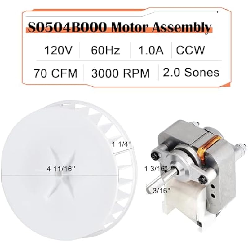 - ► Parameter of Nutone S0504B000 – 120 Volt, 60Hz, 1.0 Amps. It has a 3/16″ shaft diameter with a flat and a shaft length of 1 3/16″, 4 11/16” Dia x 1 1/4” H Blower Wheel. ► Package: This nutone s0504b000 motor assembly includes a fan motor and blower wheel, ensuring a seamless replacement for select models.