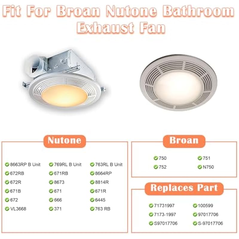 - ► Fit For Broan Nutone Bathroom Exhaust Fan Models – Nutone 8663RP B Unit, 769RL B Unit, 672RB, 763RL B Unit, 671RB, 8664RP, 672R, 8673, 8814R, 671B, 671, 671R, 672, 666, 6445, VL3668, 371, 763 Rb. ► Broan 750, 751, 752, N750. ► Replaces Part: 71731997, 100599, 7173-1997, 97017706, S97017706, S-97017706.