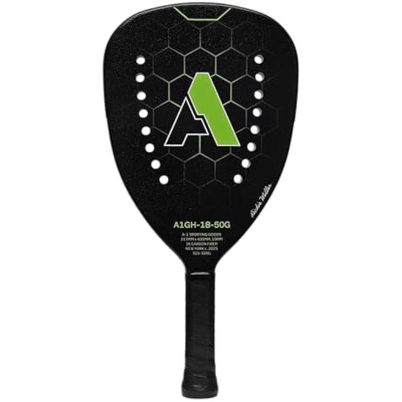 - PADDLE-FACE TEXTURE & HOLE PATTERN: The A1GH-18-50G has a medium-texture grit face, the preferred choice for players, which strikes the perfect balance—delivering ample traction for generating spin at all skill levels, while ensuring exceptional control and precision. A-1 is the innovator of the arched hole pattern, strategically placing holes along the sides of the paddle, enhancing swing speed and creating the largest, sweet spot available on any paddle
