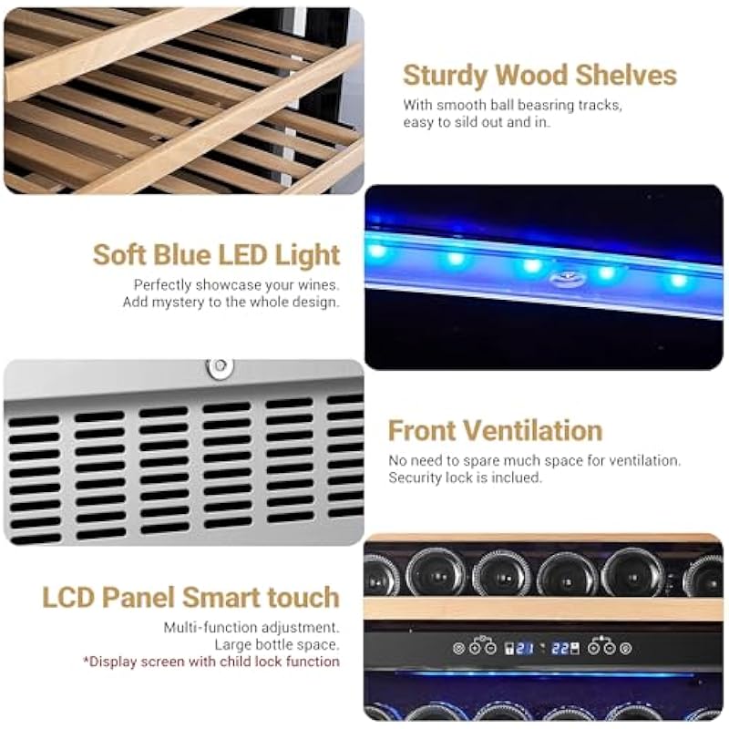AAOBOSI 46 Bottles Wine Fridge, 24 Inch Wine Cooler with Dual Zone, Freestanding and Built-in Wine Refrigerator with Blue LED Light and Adjustable Shelves, Double-Layer Glass Door, Safety Lock