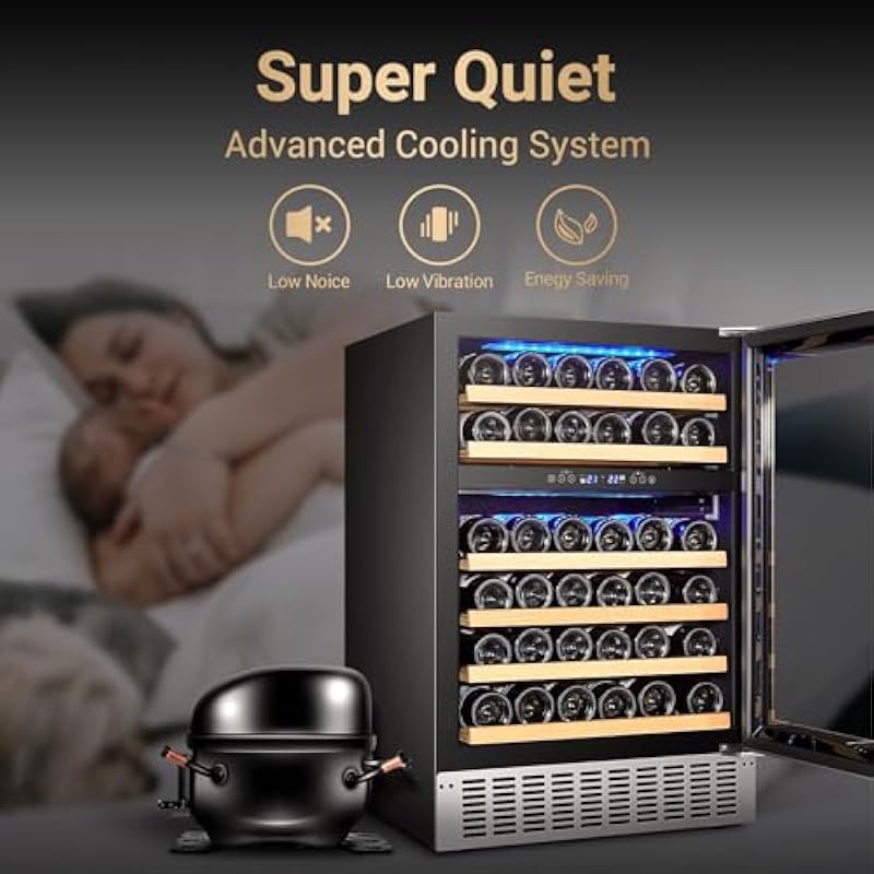 - 【Low Noise Level】AAOBOSI dual zone wine cooler’s compressor operates at only 45 decibels, which reduces vibrations and ensures the quality of the wine. It is almost the same as a whisper to achieve both high-efficiency refrigeration and quiet at the same time, and at the same time, your life is upgraded and won’t disturb your daily life.