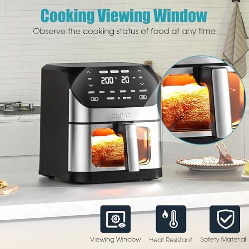 - Multifunctional Air Fryer: With a 6.2 QT capacity and 1500W power, this air fryer is equipped with a high-definition touch screen, built-in cooking light, and heat insulation viewing windows are designed to be the perfect assistant for your cooking and decoration of your kitchen counter. It can replace a variety of kitchen appliances such as a toaster, rotisserie, fruit dryer, oven, etc., perfect for families who pursue a healthy diet.