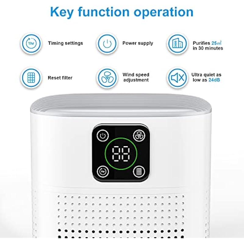 - 🔥【Portable & Smart Design】 Air purifiers for bedroom is portable and powerful, completely refreshed air in just 30 minutes in 600 sqft, and powerfully deliver clean air 90-120m³/h; Meanwhile our air cleaner is with LCD touch display, function with 3 Fan Speeds, 9 timer options, sleep mode, filter replacement reminder, You can easily operate it only by the indication icons on the screen.