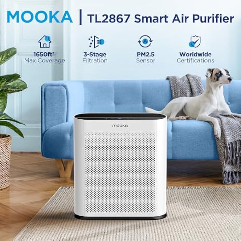 - PM2.5 AIR QUALITY SENSOR: MOOKA TL2867 air purifier utilizes the latest dust sensing technology with a built-in chip that detects the real-time air quality in the house. In auto mode, it will automatically adjust the fan speed according to the air quality of the room.