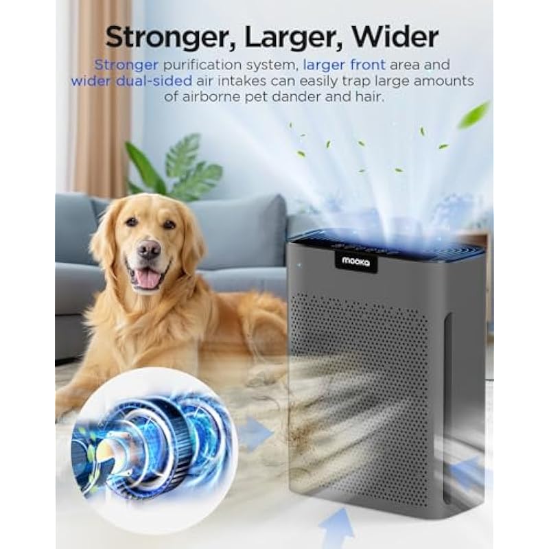 - HIGHER AIR INTAKE & LARGER COVERAGE FOR PET LOVERS: this air purifier for home pets is designed with a larger front air inlet and wider dual-side air inlet. Compared to the single air inlet design, it can trap airborne pet hairs and odors more easily. This air purifier for large room can clean up to 2200 ft² per hour