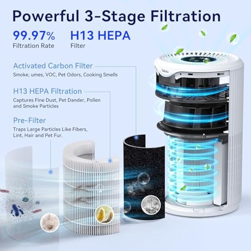 - [HIGH-PERFORMANCE 3-STAGE FILTER] Tailulu H13 True HEPA air purifiers adopt a 3-stage filtration system, including a pre-filter, H13 true HEPA filter, and charcoal filtration, which purify air particles as small as 0.3 microns such as smoke, pet hair, dust, pollen, cooking smell.