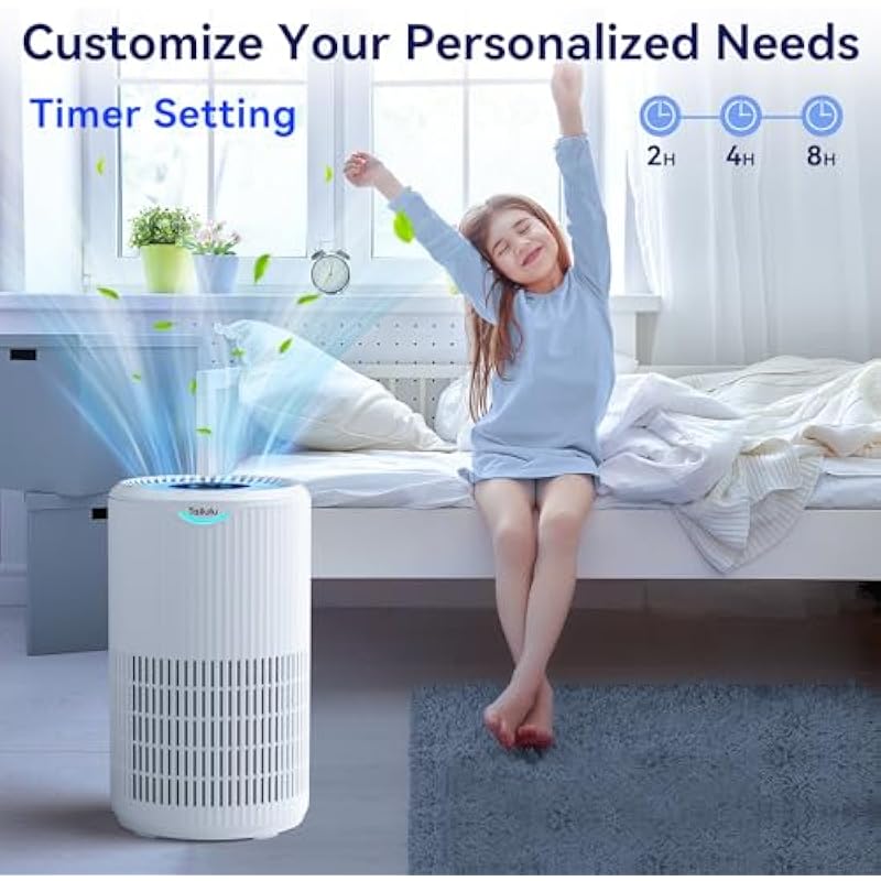 - [TIMER SETTING, 3 FAN MODES & FILTER REPLACEMENT REMINDER] 3 timer options (2H/4H/8H) allow you to customize the timer of the room purification time. Our HEPA filter air purifiers have 3 wind modes to meet your needs: high, low, and sleep mode. The smart filter indicator light will auto-on to remind you it’s time for a new filter. We recommend you replace the filter every 3-6 months depending on the environment and usage frequency. (Search B0BFX15HBS to find the Tailulu D09 replacement filter.)