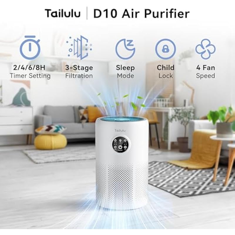 - [User Friendly] Designed with smart touch panel, Tailulu D10 air purifier for home pets is easy to use with functions like 4 fan speed, sleep mode, child lock, timer, filter replacement reset light, aromatherapy sponge and Optional ON/OFF night light. You could set a timer (2H/4H/6H/8H) for cooking, working, sleeping as you need so that you won’t forget to turn it off to cause unnecessary waste.