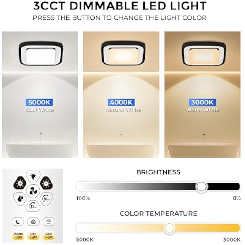 - [DIMMABLE 3CCT LIGHT & NIGHT LIGHT] Customize your bathroom lighting with dimmable brightness and three color temperature options (3000K/4000K/5000K) to perfectly suit any mood or time of day. The bathroom fan with light features an independently controlled night light that provides soft, low-glow illumination for safer and more comfortable late-night bathroom visits