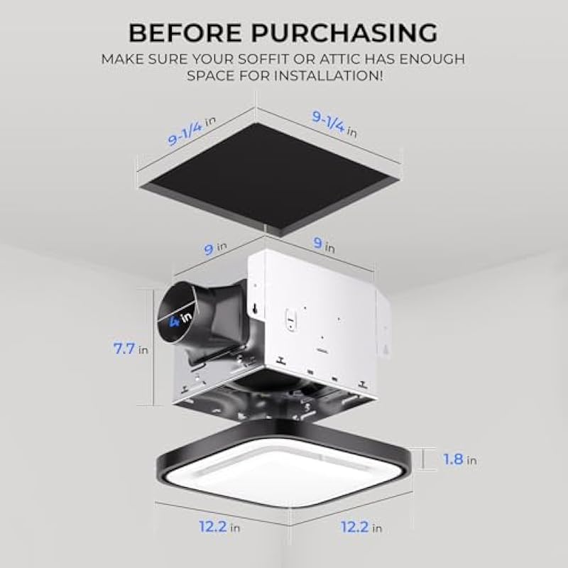 - [SIMPLE INSTALLATION] Forget complicated rewiring! This bathroom vent fan is fully controlled by a remote, eliminating the need for wall switch wiring. Installation is quick and hassle-free, saving up to 80% of installation time compared to traditional fans. Includes clear instructions and an installation video. Fits ceiling openings 9-1/4″ x 9-1/4″ x 7-3/4″ and works with standard 4-inch ducting. Note: remote battery not included