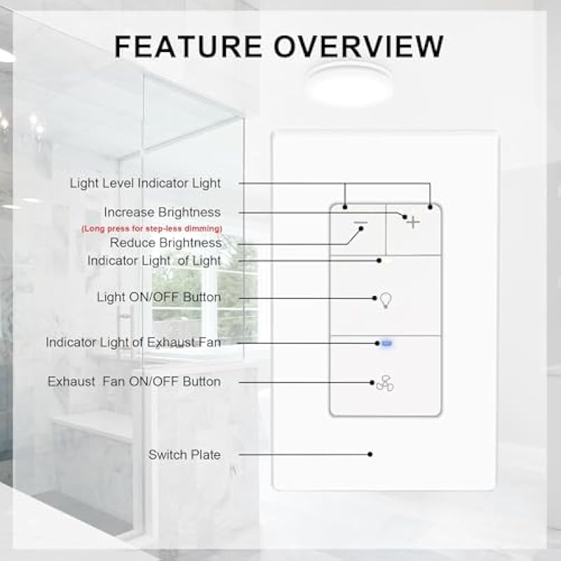 - DUAL CONTROL: This dimmer switch not only adjusts the brightness of your lights but also conveniently controls the on/off function of your exhaust fan, providing seamless control over both lighting and ventilation. The switch defaults to night light mode when turned on