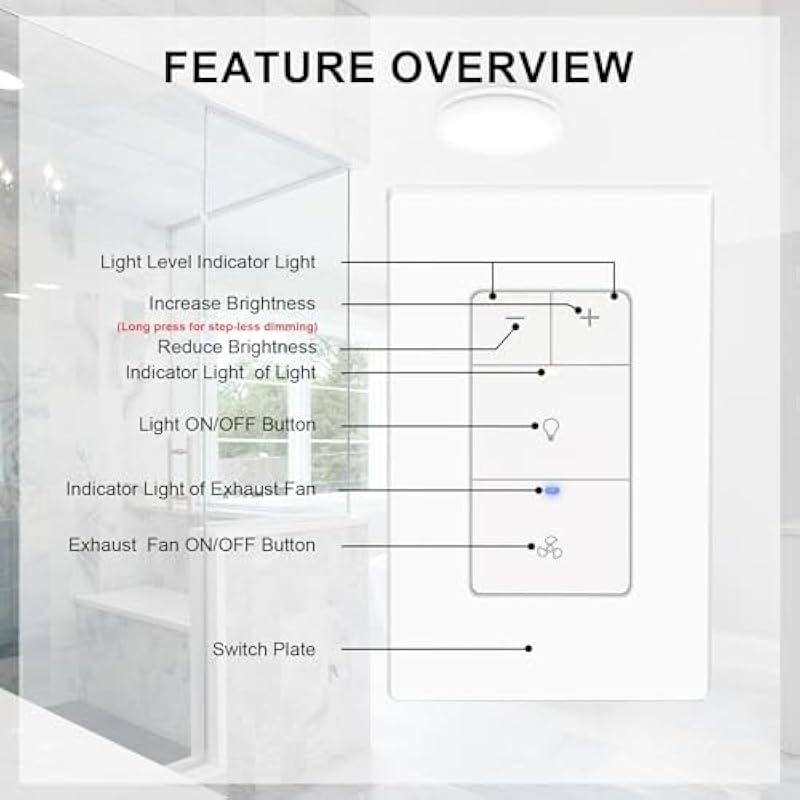 - Dual Control: This dimmer switch offers dual control of both lighting and exhaust fan functions, giving you seamless command over brightness and ventilation in one device. Perfect for bathrooms, laundry rooms, basements, and more.
