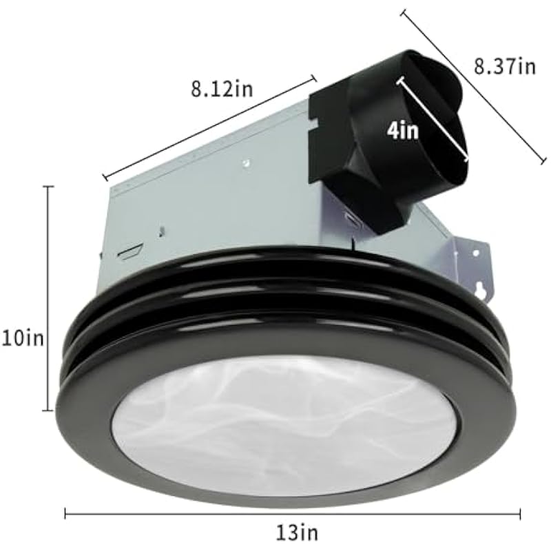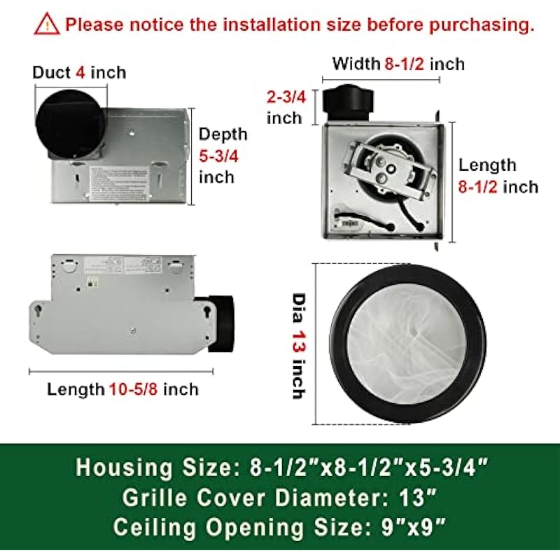 - EASY INSTALLATION: The bathroom fans for ceiling is easy to install or replace existing product for DIY’ers with no attic access required. Housing Dimensions 8-1/2″ x 8-1/2″ x 5-3/4″. Light Cover diameter is φ13. Click the installation guide on this page for more details and professional instruction