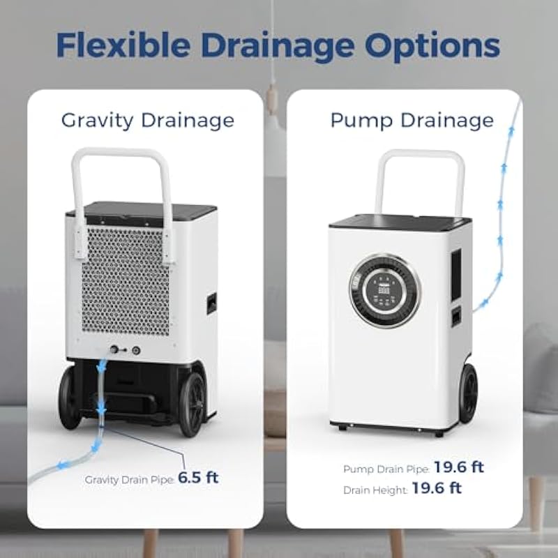 - 【Dual Drainage Options】This unit supports both gravity drainage (via included hose for continuous operation) and pump-assisted drainage (capable of vertical lift up to 19.6 feet), offering adaptable installation solutions to meet diverse environmental needs.