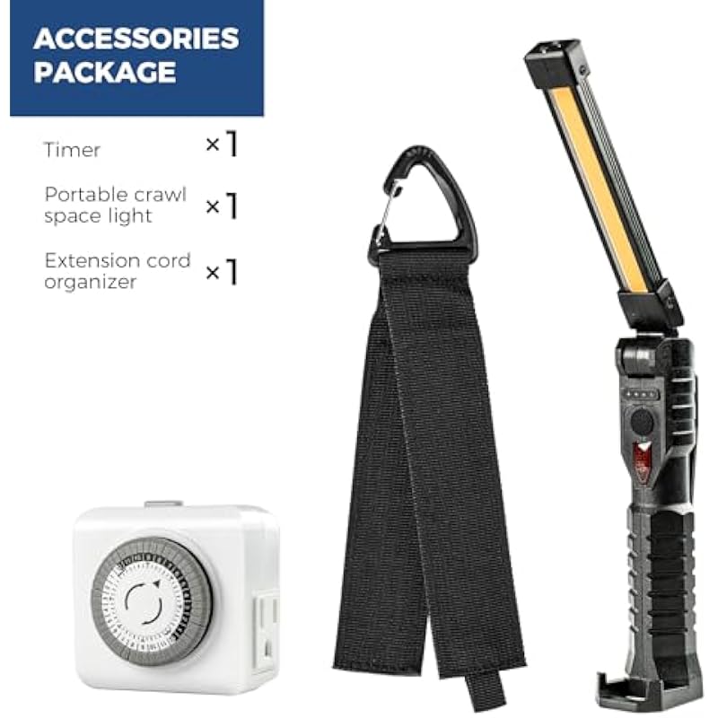 - This comprehensive bundle includes three essential items that provide convenience for your life: 1x Indoor Mechanical Light Timer, 1x Portable LED Work Light, and 1x Extension Cord Organizer