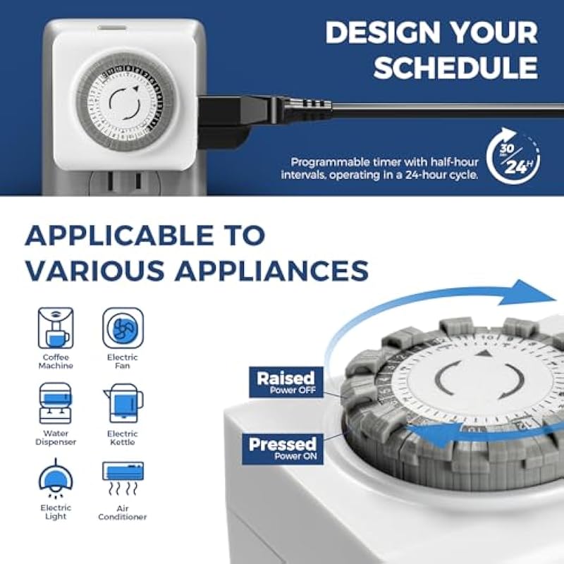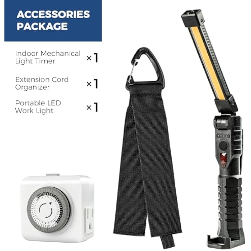 - This comprehensive bundle includes three essential items that provide convenience for your life: 1x Indoor Mechanical Light Timer, 1x Portable LED Work Light, and 1x Extension Cord Organizer