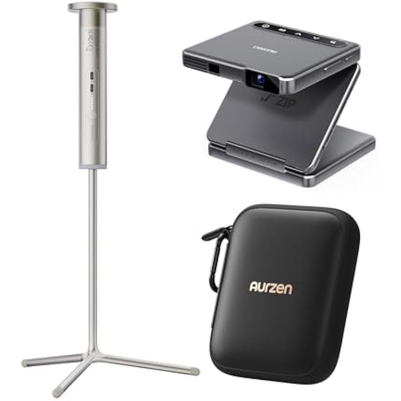 Aurzen ZIP Tri-Fold Truly Portable Grey DLP Projector with PowerPlay Stand and CasePlay – Zero-Lag Focus, One-Click Screen Mirroring, 3H Playtime