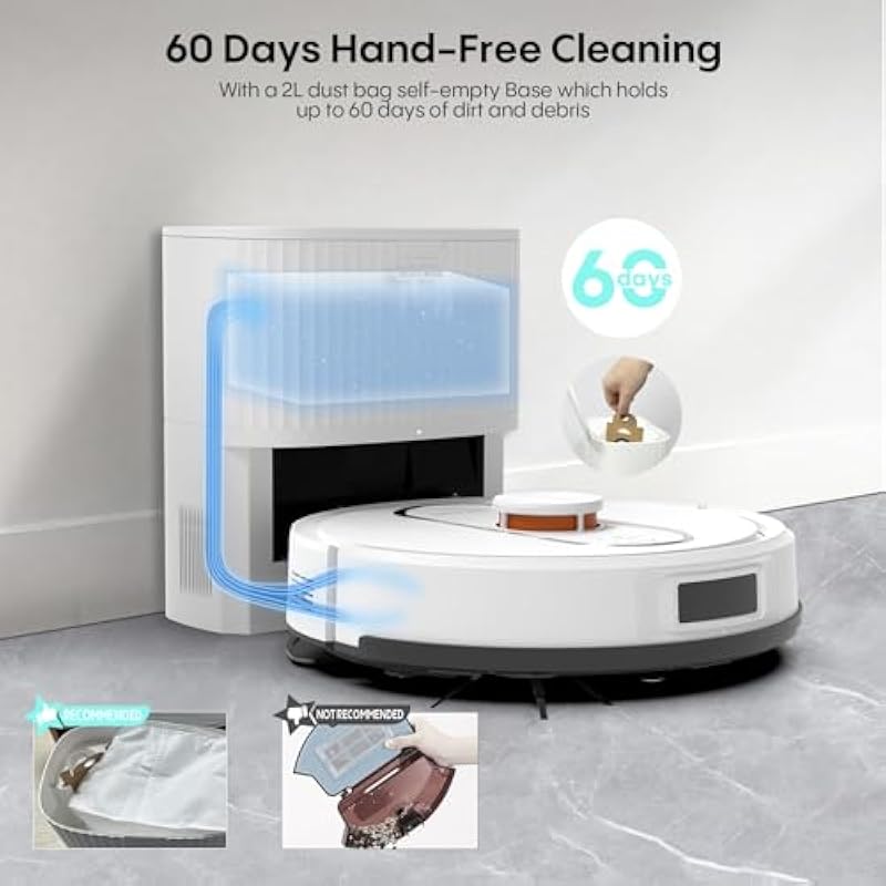- 【60 Days Hands-Free Cleaning】This robot vacuum and mop comes with a high-capacity self-emptying base that automatically collects debris into a sealed bag, preventing clogs and maintaining powerful suction. Enjoy two months of effortless cleaning—no bin emptying needed. Just set it and forget it!