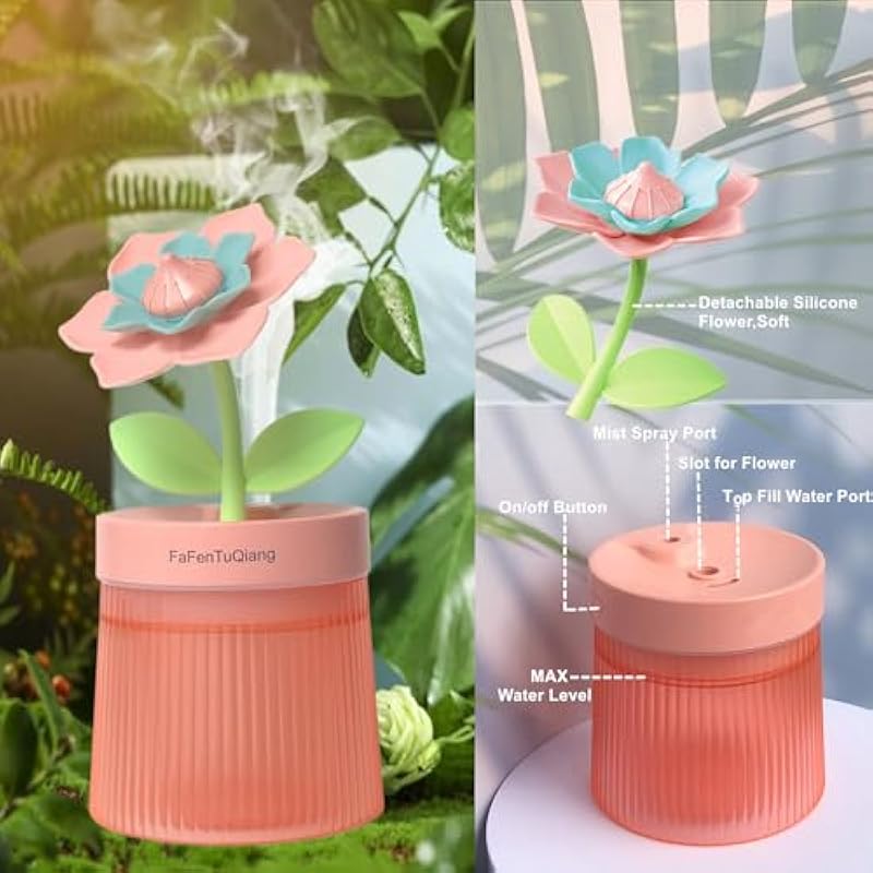 - Bionic Watering Flower, Top Fill Water: Our portable ultrasonic mini humidifier with creative design silicone flower soft touch and pretty.It is a high quality desk small humidifier also looks like a potted plants, let you mimic bionic watering flowers, it is convenient to add water without having to open the lid of the humidifier, lively and funny