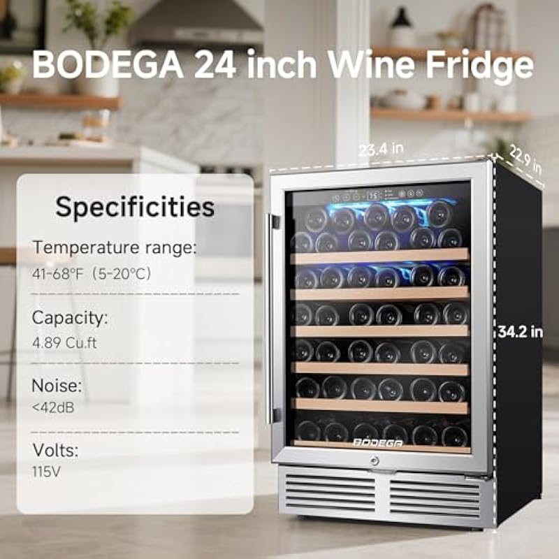 BODEGA Wine Fridge Freestanding, 24 inch Under Counter Wine Refrigerator, Champagne Cooler with App Control, Glass Door, for Kitchen, Bedroom, Home, Office, Holds 52 Bottles
