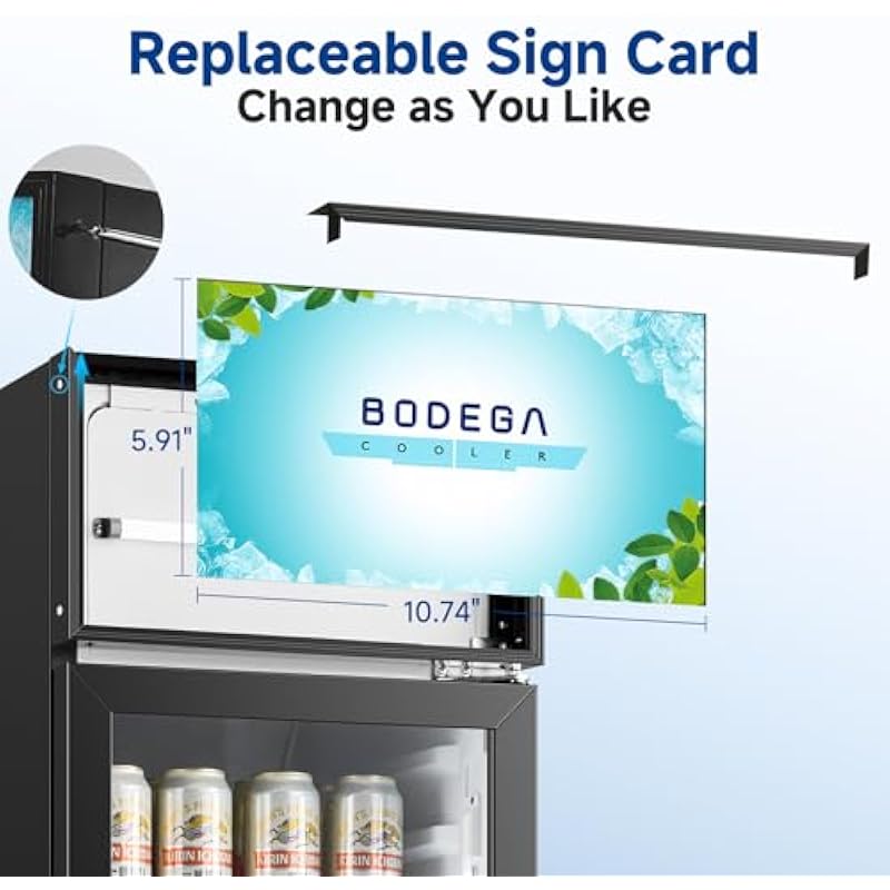 - [Replaceable Light Box Signage Cards] This commerical cooler not only boasts excellent cooling performance, but also comes with an advanced lighting system that includes a light box and a white LED light strip. The lightbox is ingeniously designed, allowing for easy replacement of the signage card by removing screws on both sides. This feature enables you to easily change the signage cards according to the needs of your shop to emphasise your shop’s professional image, to promote special events or to create a unique festive atmosphere.