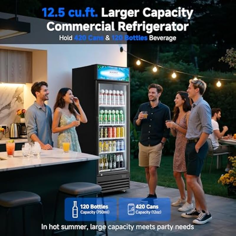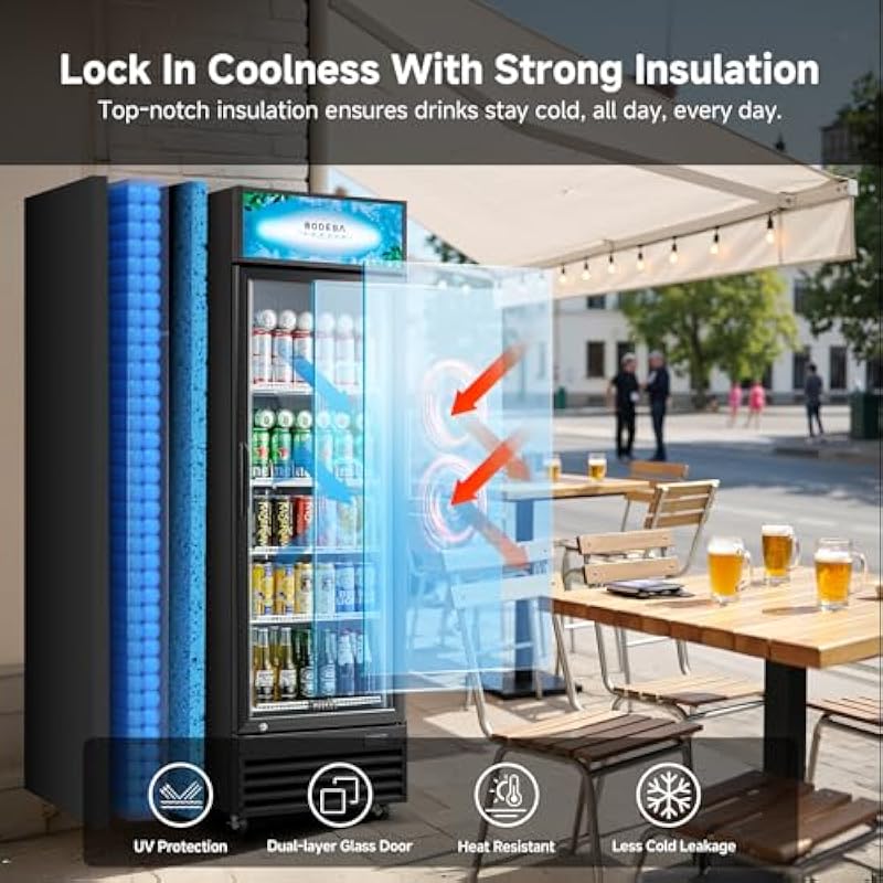 - 🥤【Fast Cooling & Energy-Saving】 BODEGACOLER commercial merchandiser refrigerator use R600a environmentally friendly refrigerant and powerful compressors.BOODAGACOOLER commercial beverage cooler adopts a powerful air-cooled frost free direct cooling system,a 20cm high air flow fan,ensuring precise airflow and accelerating cold air circulation. Exterior tempered glass enhances insulation and its superior impact resistance improves safety. You won’t have to worry about icing as this Beverage refrigerator and cooler has an automatic defrost.