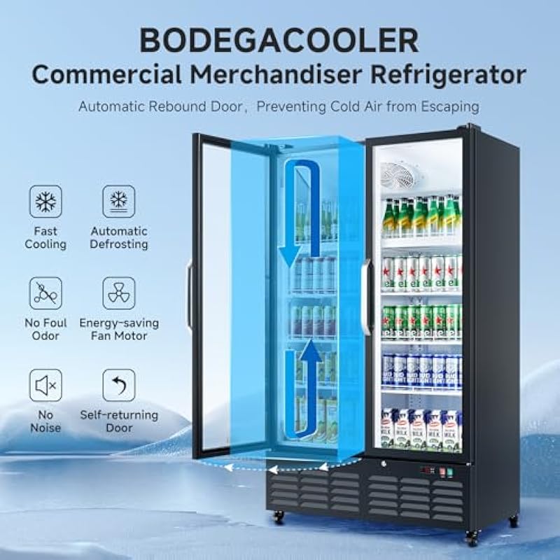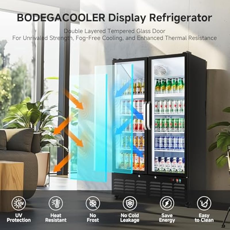 - Double-Glass for Optimal Display: BODEGACOOLER commercial beverage refrigerator is equipped with double-glass doors, offering a clear view of your beverages and merchandise at a glance, ensuring drinks are always visible and easily accessible. This advanced glass door merchandiser refrigerator not only enhances product visibility but also provides increased strength for long-lasting performance. Additionally, it includes a magnetic gasket for a secure seal, keeping food fresh for longer.