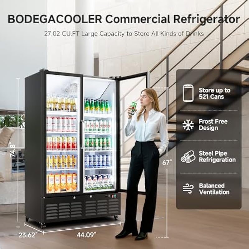 - Spacious & Versatile: BODEGACOOLER commercial refrigerator boasts an impressive 27.02 cu. ft. of effective volume, ensuring ample space for excellent visibility and effective product placement. This versatile display refrigerator is ideal for showcasing soda cans, yogurt, packaged salads, and fruit cups in bars, offices, stores, and other commercial settings, providing both an attractive and functional solution for any environment.
