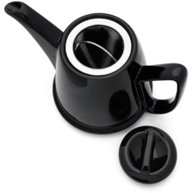 - The black handle of the dark stoneware teapot with stainless steel filter is maximally warm to the touch