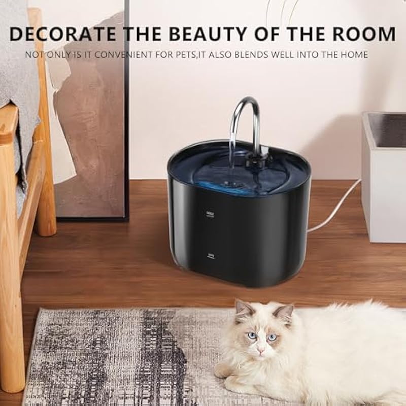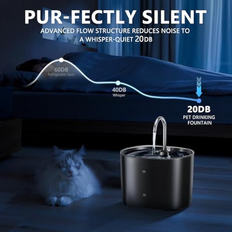 - SUPER QUIET: This cat water dispenser uses a 5w energy saving water pump. Our pet water fountain Low power consumption, quiet, smooth water discharge, no splashing. You can sleep peacefully even if cat fountain placed right next to your bed. Unique water flow structure filters out noise, the noise of the whole indoor cat fountain is ≤ 30 decibels, quieter than a whisper.