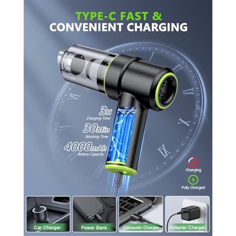 - 【TYPE-C SAFE AND EFFICIENT CHARGING MODE】This hand held cordless rechargeable vacuum cleaner has a 4000mAh battery and a Type-C charging cable that can be charged in the car or elsewhere via a USB port. With a charging time of only 3 hours and 30 minutes of operation, you can effectively save your time and achieve efficient cleaning