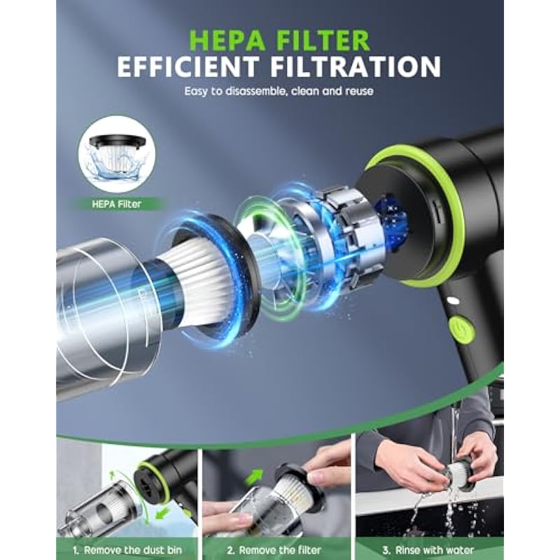 - 【HEPA HIGH EFFICIENCY FILTER】This handheld vacuum is equipped with HEPA filters that can be easily removed for cleaning and reuse. It can efficiently filter out the absorbed impurity particles, protect the motor and the fuselage from being damaged, and extend the service life of the vacuum cleaner