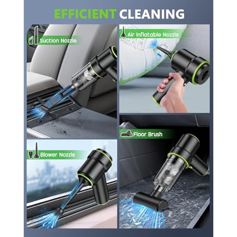 - 【MULTIFUNCTIONAL VACUUM CLEANER】The cordless portable car vacuum cleaner comes with 6 accessories for blowing, sucking and inflating a variety of use scenarios. One end of the car vacuum is the suction function, can use the floor brush, suction nozzle and brush, powerful suction can easily suck up a variety of impurities and hair. The other end of the car vacuum is the blowing and inflating function, using a mouthpiece and an inflating nozzle, you can easily blow away fine dust from various crevices such as windows and keyboards, or inflate balloons, swimming rings, etc