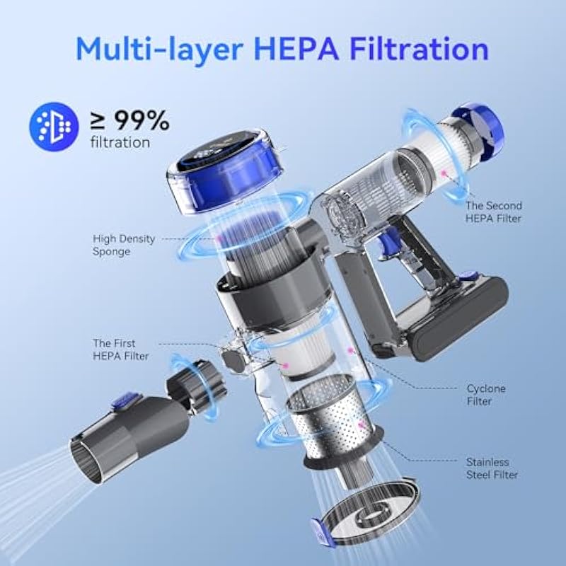 - ✦[High-Efficiency Filtration] This cordless stick vacuum cleaner has a 5-stage high-efficiency filtration system and washable HEPA filtersthat can capture up to 99.99% of microscopic fine particles as small as 0.1microns.