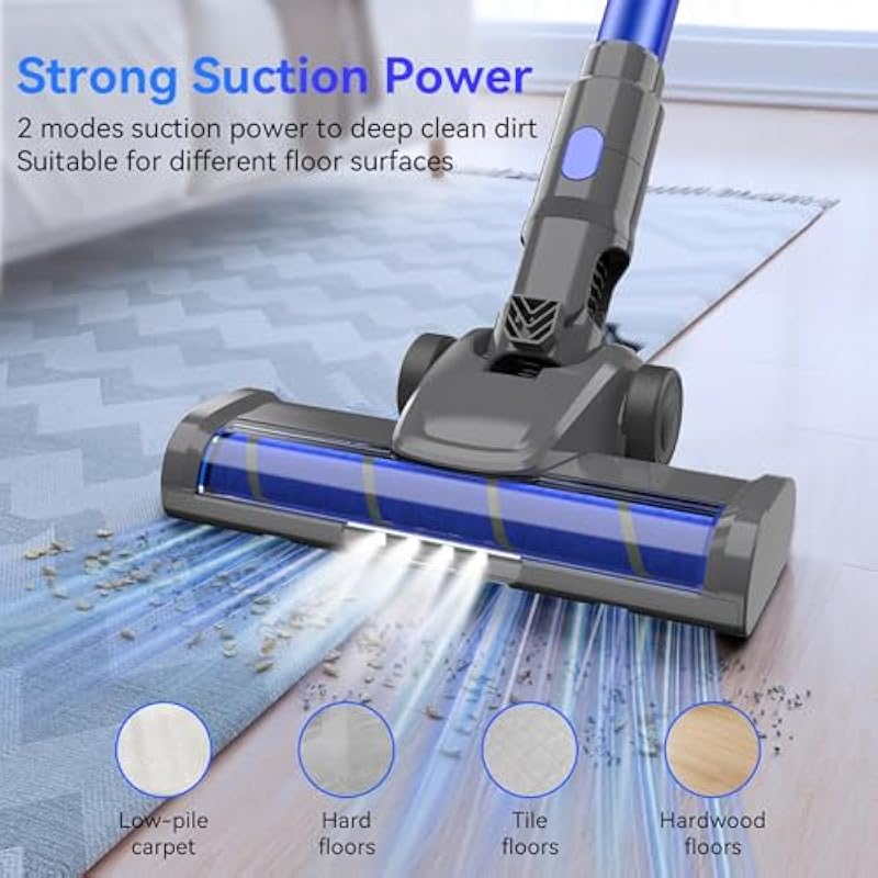 - ✦[Flexible LED Motorized Floor Brush Head] This lightweight portable stick vacuum cleaners for the home with the LED headlights of the floor brush illuminate the dust, debris, and hair under furniture or other hard-to-reach dark corners and track it. Flexible 150° sideways rotation and 90° up and down rotation let you clean the dust under furniture and bed.