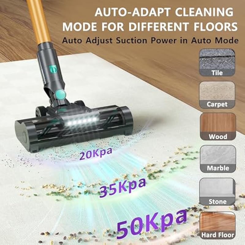 - 【Flexible Anti-tangle Brush】The improved V-shaped brush roller effectively solves the bristle tangle problem that often occurs in conventional powerful cordless vacuum cleaners for home. The brush head offers excellent flexibility, being able to move laterally from 0° to 180° and vertically from 0° to 90°. The LED headlight illuminates corners and ensures that no hidden dust escapes during deep cleaning.