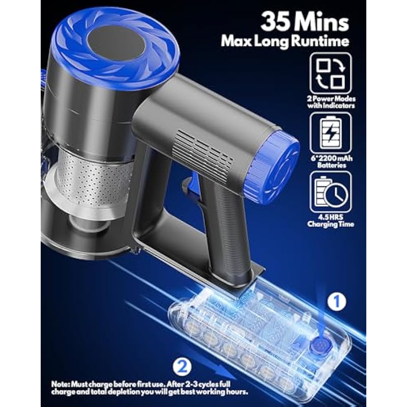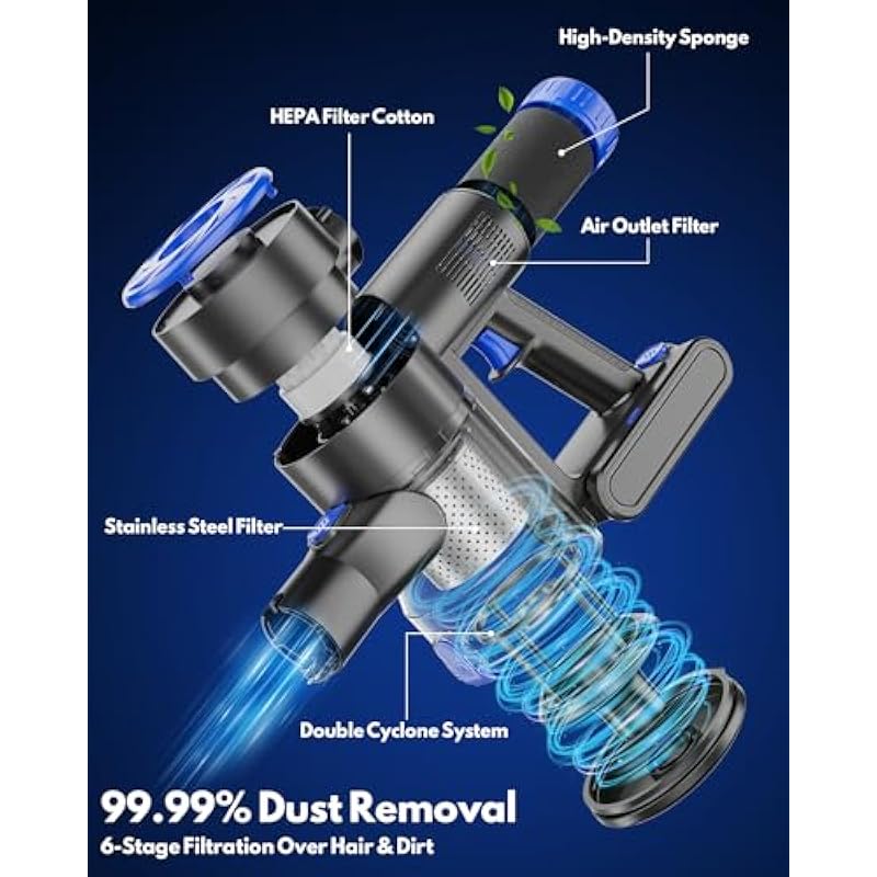 | Special Feature | 2 Suction Modes 6*2200mAh Battery Pack 15-35 Mins Runtime 4.5H Quick Charging 6-Stage High-efficient Filtration Self-Standing & Bendable Brush LED Headlight 2.5lbs Lightweight 1L One-Click Dust Cup 8 IN 1 Combinations 65db Ultra-Quiet |