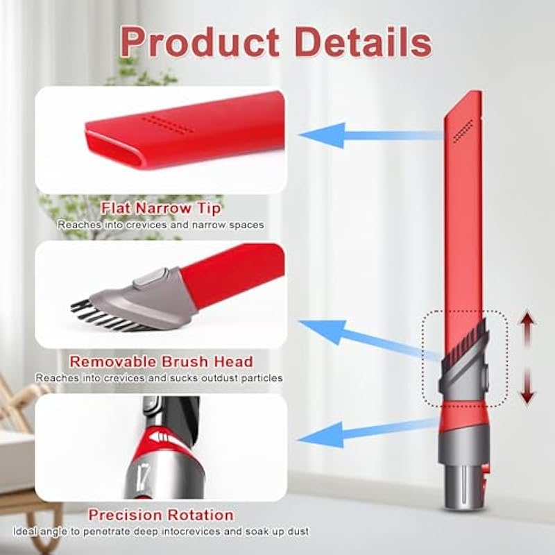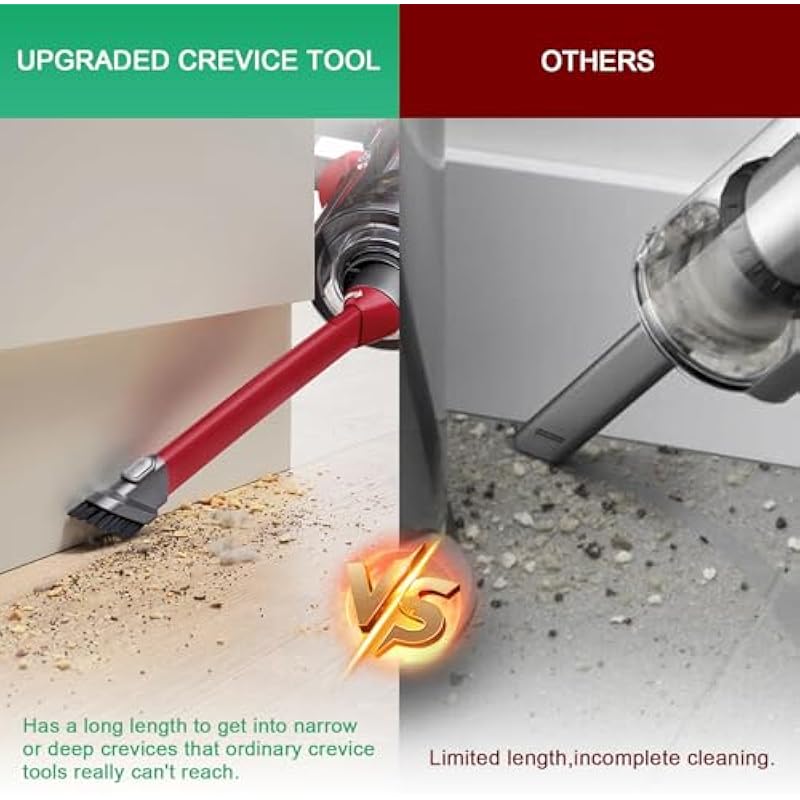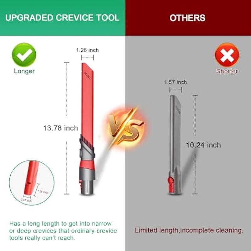 - Upgraded Crevice Tool:The upgraded rotating crevice tool has a swivel and telescopic function, a feature that makes it easy to move between corners to ensure a thorough clean every time. The retractable tip increases the contact area for vacuuming, quickly removing dust to improve cleaning efficiency. The swivel mechanism is particularly useful for removing stubborn dirt and dust particles from crevices. Customize the angle to suit your cleaning needs to deliver superior cleaning performance. Whether under furniture, between car seats or along skirting boards, these crevice tool attachments are designed to provide maximum flexibility and precision for deep cleaning