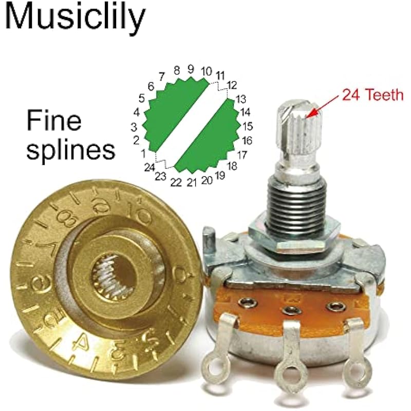 - Fine 24-spline split shaft imperial sized pots for American-made guitar knobs, split shaft diameter: 6mm (15/64 inch), thread diameter: 9.5mm (3/8 inch), thread height: 9.5mm (3/8 inch)