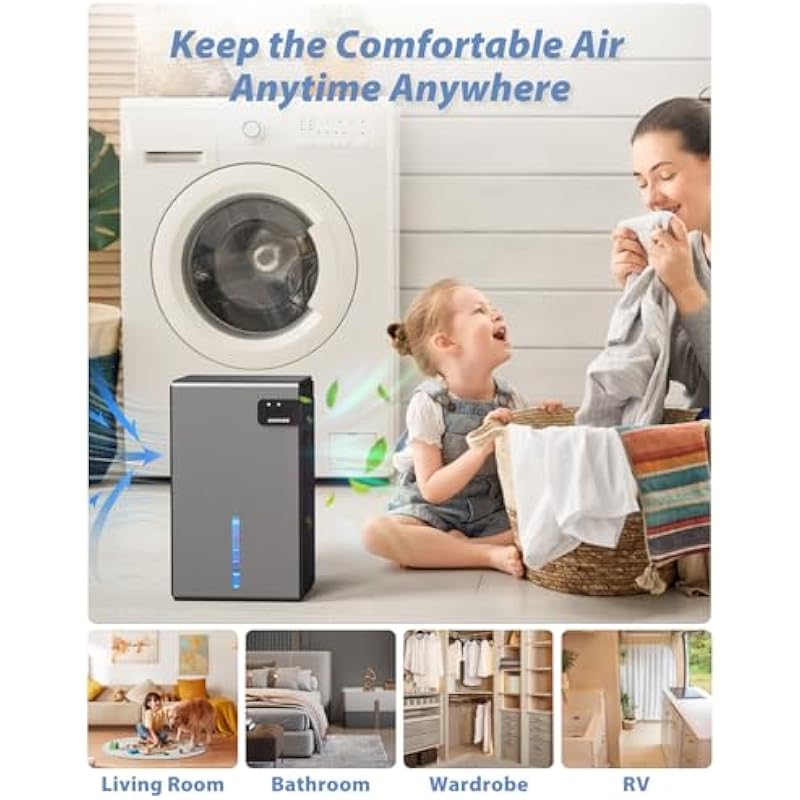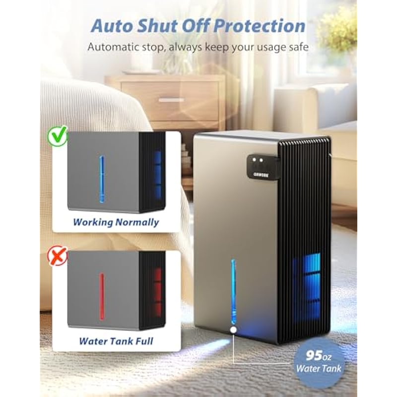 - 【Versatile Use Across Different Spaces】Ideal for rooms up to 800 sq. ft., including bedrooms, bathrooms, kitchens, closets, RVs, and small basements, the ONWORK dehumidifier helps maintain humidity below 45%, reducing allergens, mold risk, and musty odors for a healthier indoor environment.