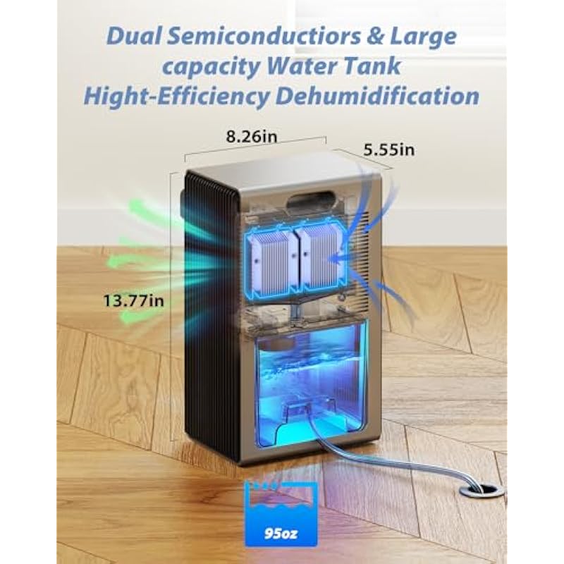- 【Smart, Hassle-Free Operation】With a large 95 oz (2800 ml) water tank, this dehumidifier supports continuous operation without frequent emptying. It also comes with a drain hose for automatic drainage, making it perfect for bathrooms, kitchens, and other high-humidity areas—no more daily water dumping!